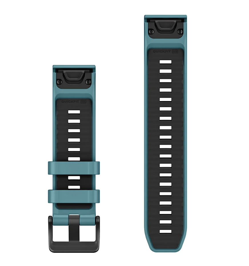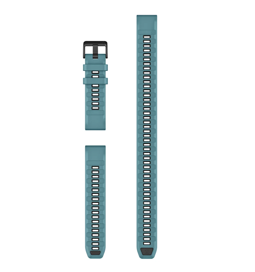 Оригинальный силиконовый ремешок Garmin Quickfit 22 mm в ярком цвете Turquoise, оснащенный 2 вариантами длины нижней части: классическая длина (12,4 см) и ремешок увеличенной длины (26,5 см), позволяющий использовать часы с гидрокостюмом либо надевать часы поверх одежды (лыжной куртки, например)