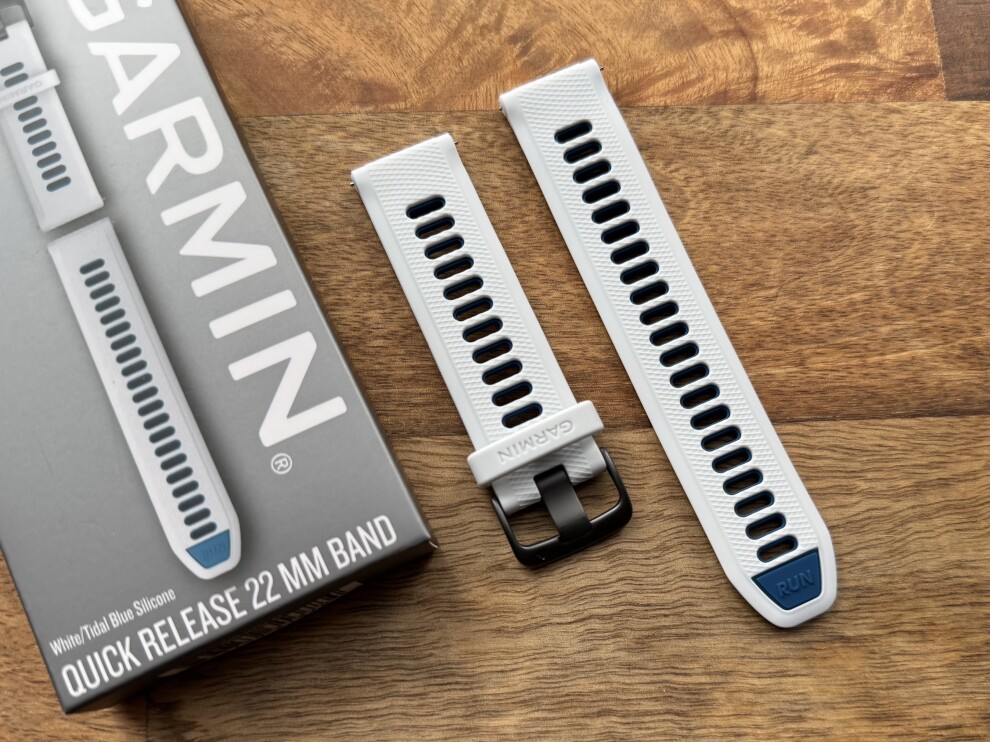 Добавьте яркости своему стилю вместе с покупкой оригинального силиконового ремешка Garmin Quick Release 22 mm Whitestone/Tidal Blue with Slate Hardware
